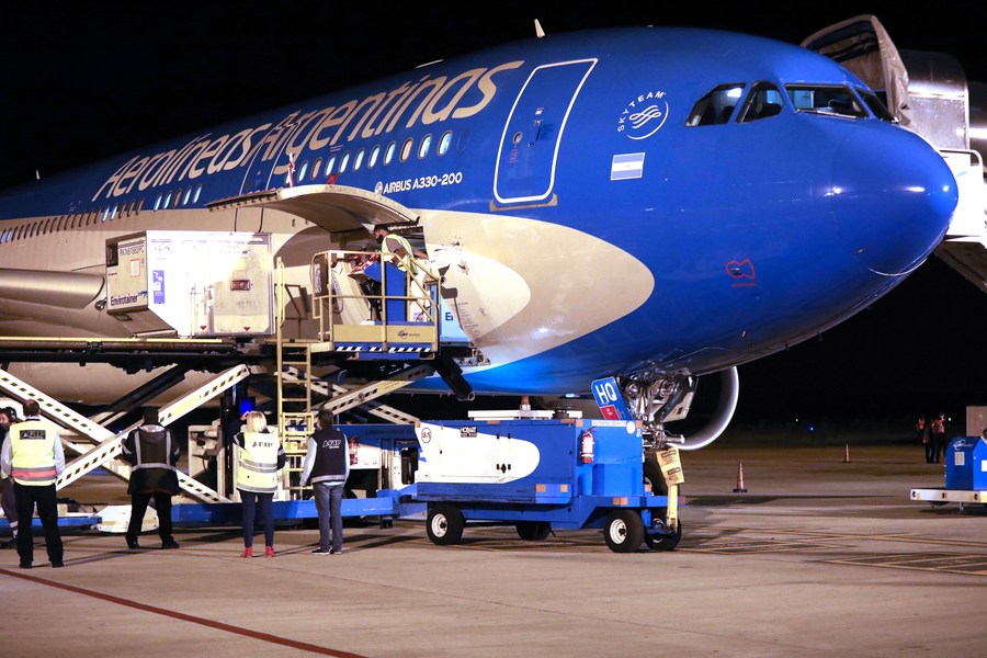 Trabajadores descargan nuevas vacunas contra el coronavirus proporcionadas por China en el Aeropuerto Internacional de Ezeiza en Buenos Aires, Argentina, 1 de abril de 2021. (Xinhua/Martin Zabala)