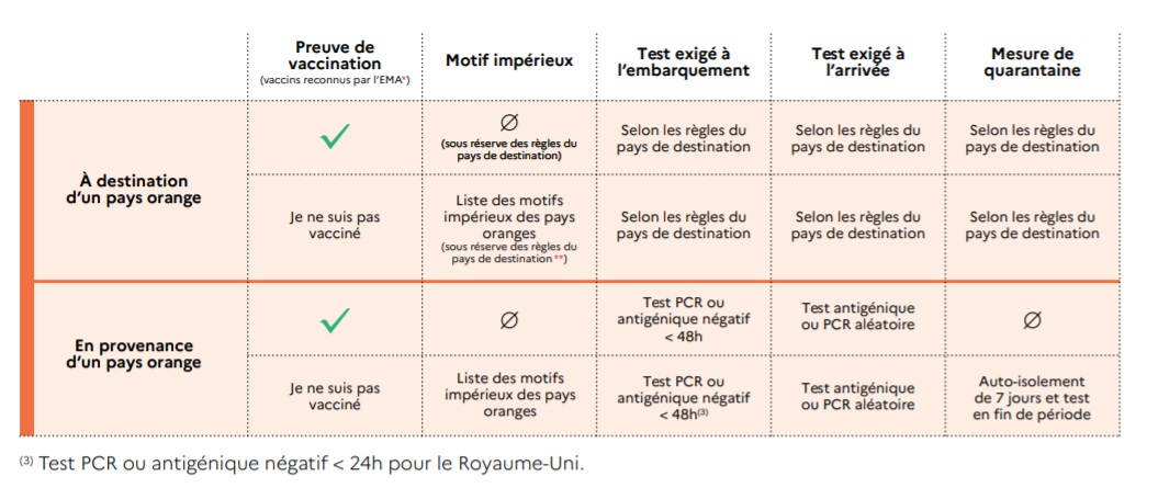 Los países naranja identifican los países en los que el virus se está propagando activamente en proporciones controladas, sin la propagación de variables preocupantes. Si están vacunados, los viajeros a estos países están exentos de razones de peso para ir allí. Además, no están sujetos a autoaislamiento al regresar a Francia (consulte la tabla resumen de procedimientos y restricciones a continuación).