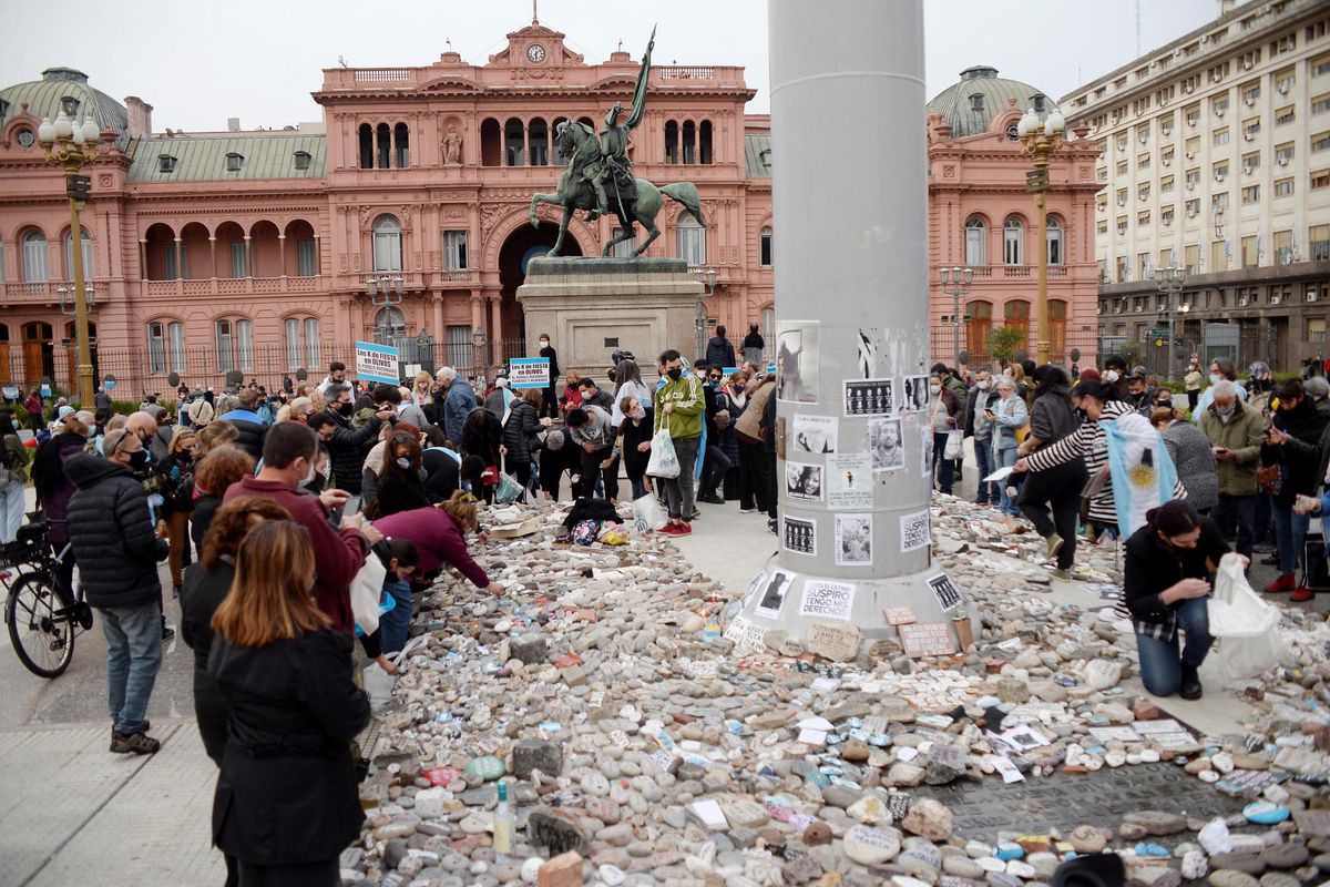 Familiares de las víctimas del Covid-19 se manifestaron en Buenos Aires el lunes contra el jefe de Estado, colocando cientos de piedras con los nombres de los muertos de la pandemia frente a la “Casa Rosada”, el palacio presidencial en Buenos Aires.