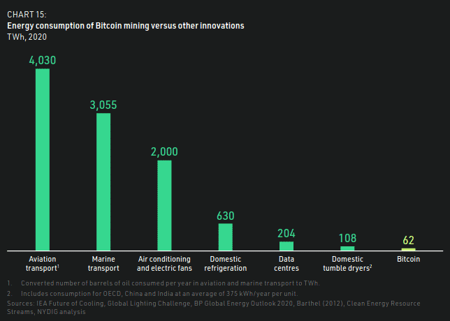 « Estimamos que Bitcoin consumió 62 TWh de electricidad en 2020, lo que resultó en 33 millones de toneladas de emisiones de CO2, lo que no es significativo a nivel mundial. BTC representa solo el 0.04% del consumo mundial de energía primaria, el 0.2% de la producción global de electricidad y el 0.1% de las emisiones globales de carbono. »