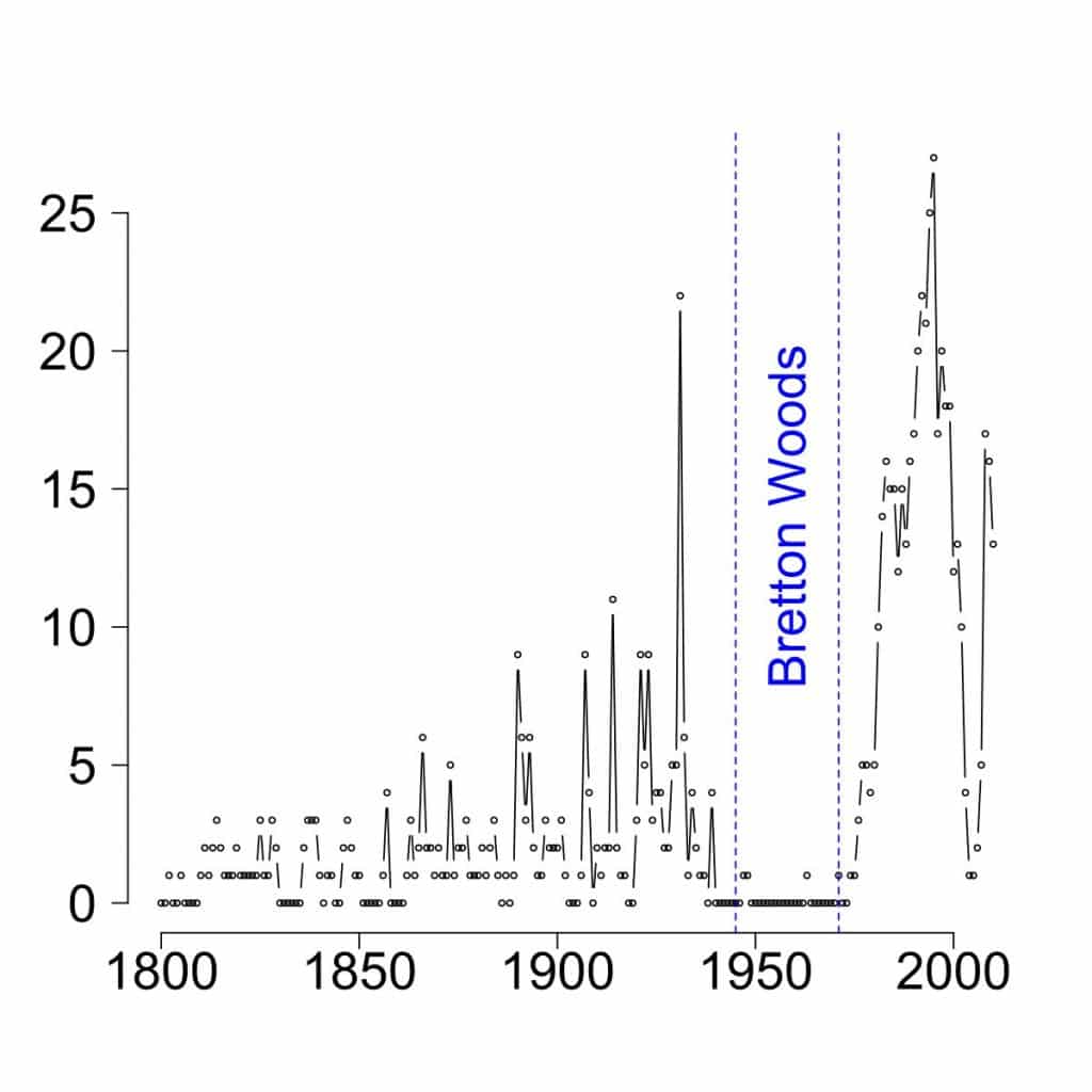 A continuación se muestra un gráfico que resume las crisis bancarias del último siglo. Tenga en cuenta que no hay una crisis grave en el tiempo récord del oro. Nixon Terminará en 1971: