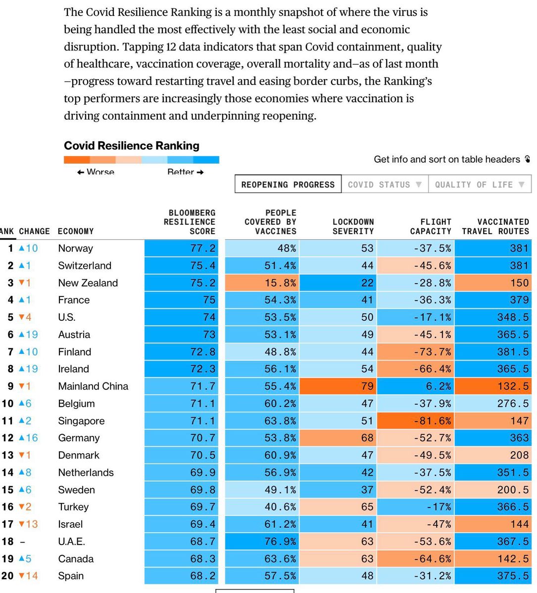 Como informa 20 Minuten, para lograr esta clasificación, Bloomberg analizó no solo las tasas de infección y muerte, las tasas de vacunación o la calidad de la atención médica, sino también la cantidad de personas que regresan a las tiendas. Vida económica y número de vuelos comerciales que pasan por el país. Esta clasificación cubre 53 estados.
