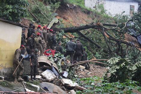Abajo, una pila de escombros, ladrillos, ropa, juguetes y otros artículos personales de las víctimas del deslizamiento de tierra.