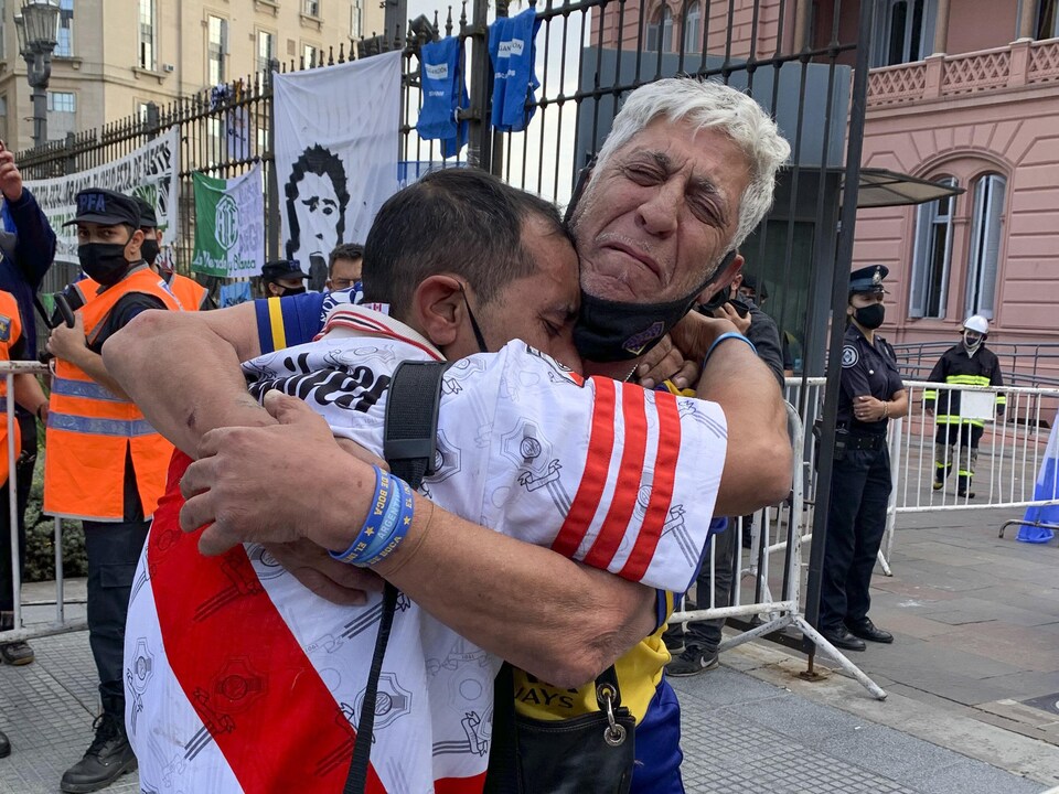 El féretro cerrado que contiene los restos de la leyenda del fútbol, cubierto con la bandera argentina y las diversas camisetas de los equipos en los que jugó, especialmente las de la Selección Argentina y el legendario número 10 Boca Juniors, tuvo que ser movido, según un fuente del gobierno. Los admiradores habían invadido el tribunal de la presidencia.