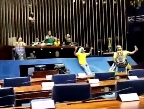 Uno de ellos se sentó en el asiento del orador en el Senado, una impresionante imitación de los manifestantes pro-Trump en el Congreso de Estados Unidos hace dos años.
