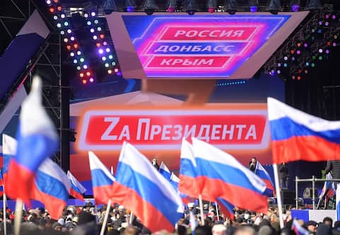 Figuras políticas, medallas deportivas y artistas subieron al escenario, se multiplicaron los mensajes de lealtad al presidente Putin, mientras decenas de miles de personas ondeaban banderas estatales y pancartas estampadas con la letra «Z».