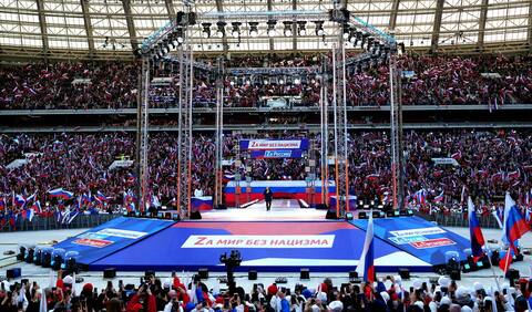Pancartas que declaran «Por un mundo libre de nazis» y «Por Rusia» se izan en el abarrotado estadio Luzhniki de Moscú, mientras Rusia justifica su operación militar en Ucrania con la necesidad de «desacreditar» al país, acusado de genocidio contra los rusos. población hablante.