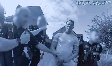 La grabación termina con el arresto del Sr. Heiko, mientras los oficiales uniformados trabajan para llevar al sospechoso a una camioneta de la policía.