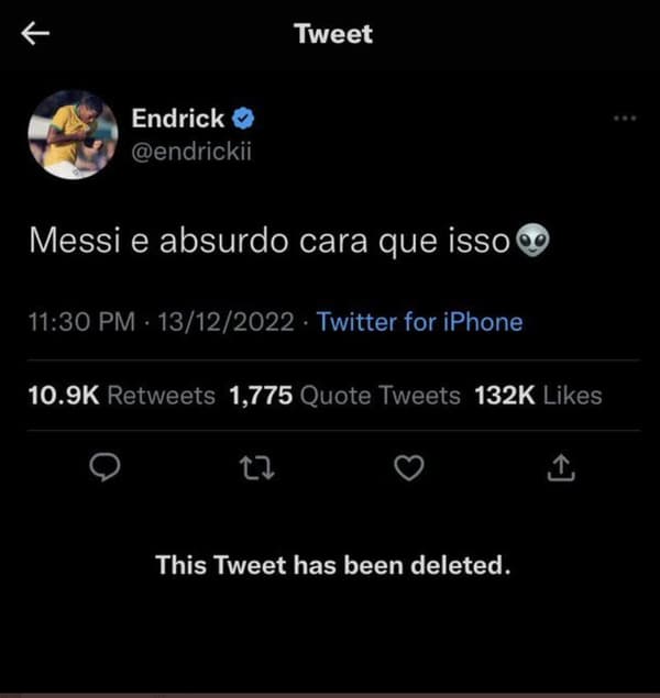«Messi, es absurdo lo que está haciendo», tuiteó Endrick a las 21:30 hora de Francia, dos más en Doha y las 17:30 en Brasil. Esas pocas palabras y un emoji ajeno a la gloria de Lionel Messi le valieron a la estrella de 16 años muchos insultos y amenazas, especialmente de parte de los fanáticos del Real Madrid.