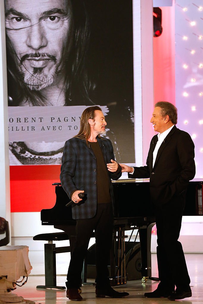 El invitado principal al espectáculo de su nuevo álbum Vieillir avec toi, el cantante Florent Pagny (L) y el presentador Michel Drucker asisten al espectáculo Vivement Dimanche. El espectáculo se llevó a cabo en el Pavillon Gabriel el 15 de enero de 2014 en París, Francia. | Foto: Getty Images
