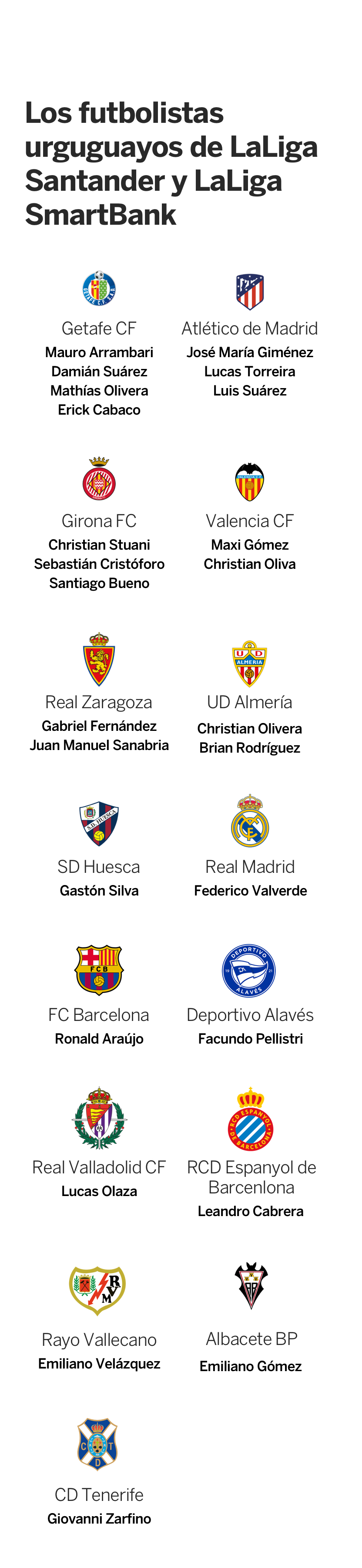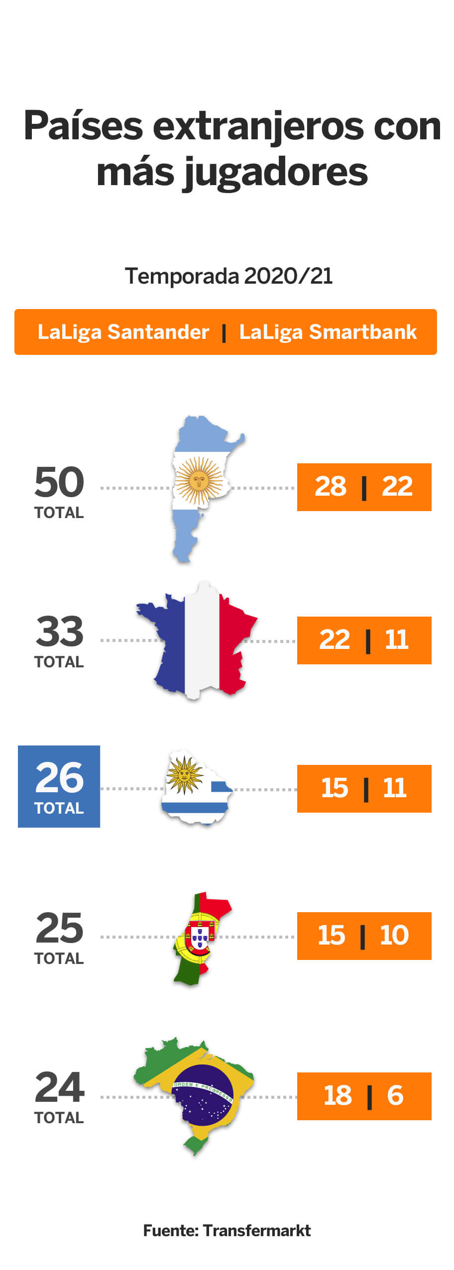 La vocal cerrada, tres veces seguidas, separadas por apenas dos consonantes, hace que sea una acumulación ruidosa, casi incomprensible, de nosotros que ha impresionado a la mayoría de los estadios de fútbol españoles. Uruguayos! Uruguayos! En casi todos los equipos de LaLiga Santander y LaLiga SmartBank había un solo equipo. Desde el ídolo deportivo Dagoberto Mall, que abrió las puertas de España a sus compatriotas en 1949, o desde Luis Suárez, el máximo goleador de la historia de la competición con 161 goles, hasta el reciente fichaje del Deportivo Alavés, el joven Facondo Pellistri, de Uruguay. Con una población de tres millones y medio, es el tercer país que más jugadores ha aportado (181) al torneo en 90 años, después de solo dos gigantes como Argentina (522) y Brasil (288), con una población de 44 millones y 209 millones respectivamente. Este fenómeno no es exclusivamente visible en España. Según CIES Football Monitor, entre los 20 países que exportan la mayor cantidad de futbolistas del mundo, solo Uruguay y Croacia tienen una población de menos de cinco millones, lo que convierte a Celestial en el país que más jugadores produce per cápita. ¿Cuál es la razón de este fenómeno?