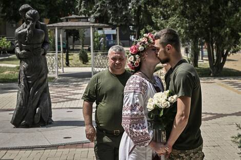 Todos ellos pertenecen a la 14ª brigada mecanizada separada que ha estado luchando contra las fuerzas rusas y prorrusas desde mayo en el este. Las parejas jóvenes se casaban frente a las oficinas de registro locales, que estaban cerradas debido a la guerra.