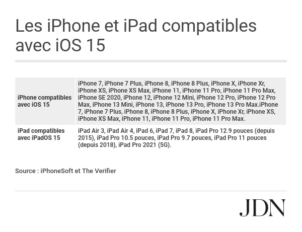 Varios sitios han publicado una lista de dispositivos iPhone y iPad compatibles con iOS 15, incluidos iPhoneSoft y The Verifier. Según esta lista, muchos modelos de dispositivos compatibles con iOS 14 no serán compatibles con iOS 15. Estos son los iPhone 6S, iPhone 6S Plus, iPhone SE, iPad Air 2, iPad Mini 4 y iPad 5 de primera generación.