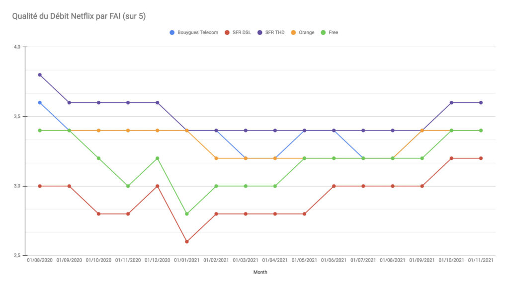 La calidad general de la llamada también está integrada. Si el 90% de los suscriptores de ISP ven Netflix a 5 Mbps, la tasa de bits máxima alcanzada por este límite se tendrá más en cuenta al calcular el resultado final. Es notable que, dadas las circunstancias, exista una proximidad tan estrecha entre Orange, SFR, Free y Bouygues Telecom, a pesar de la diversidad de estándares en juego.