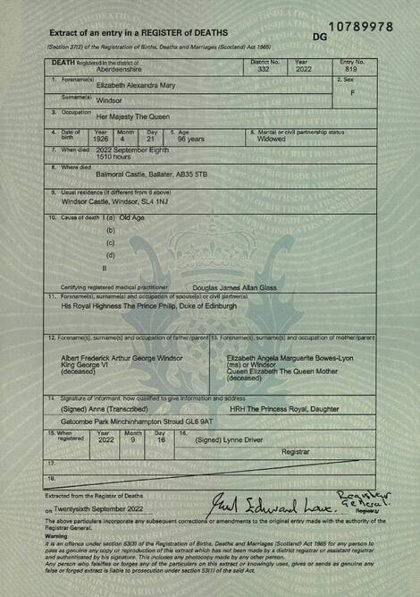 El certificado fue firmado por la Princesa Ana, hija de Isabel II, quien acompañó al Rey en sus últimas horas.