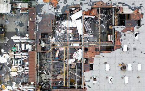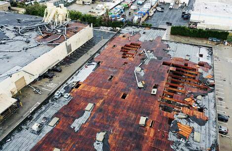 Las imágenes aéreas revelaron el alcance de los daños: agujeros en muchos techos, tuberías torcidas y rotas, y autos empujados fuera de sus estacionamientos.