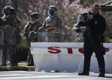 Los soldados de la Guardia Nacional se han desplegado en el edificio del Capitolio desde el ataque del 6 de enero con escudos y se apresuraron desde los edificios de oficinas parlamentarias cercanos al edificio del Capitolio. Otros tomaron posiciones cerca de los controles policiales que bloqueaban la carretera.