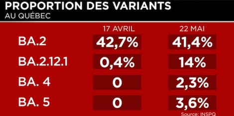 BA.4 y BA.5 se multiplican más rápido. Se estima que BA.2.12.1 se duplica en cinco días y medio, y BA.4 y BA.5 necesitan 4 días y medio. A medio plazo, son ellos los que acaban ganando la pelea”, explica la farmacéutica Diane Lamarie durante su período a Mario Dumont.